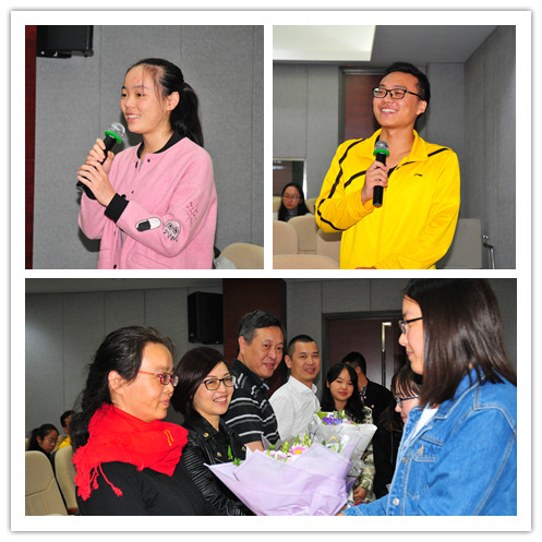 2017级数理实验班张梦帆同学深情朗诵了师范班校友陈发祥在2015年返校时的发言:“上财的成就,使得我们这些已经毕业的学子倍感荣幸,我们以自己为上财人而感到自豪......”,饱含深情的字句娓娓道出了校友们的心声。2017级经济3班蒲伟东同学代表2017级新生对学长学姐的专程前来致以真诚的感谢,他表示,学长学姐优秀的“成绩单”让他感受到学校“厚德博学 经济匡时”的深厚底蕴,如今的财大比之三十年前,硬件更加完善,软件更为丰厚,师资更富多元,我们应该珍惜现在的条件,努力学习,成为优秀、卓越的人才,才能无愧学校的培养。四名2017级新生向校友代表赠送鲜花,表达了对学长、学姐的敬意,三十年的青葱岁月之谊,百年的厚德博学之承在此刻播种,把这场珍贵的思政课推向高潮。
