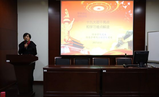 12月12日下午,甲申讲坛126期在上海财经大学经济学院举行,本次讲坛由经济学院党委和信息管理与工程学院党委共同主办。中国社科院首批学部委员、学部主席团成员兼马克思主义研究学部主任、教授、博士生导师,中国社科院经济社会发展研究中心主任程恩富教授做客甲申讲坛,带来一场题为《十九大若干亮点和学习难点解读》的十九大精神专家辅导报告会。经济学院党委书记王昉、信息管理与工程学院党委书记王淑范、经济学院党委副书记金晓茜、经济学院院长助理冒佩华、信息管理与工程学院学生办公室主任向勤及两院的师生党员参加了报告会。会议由经济学院党委书记王昉主持。