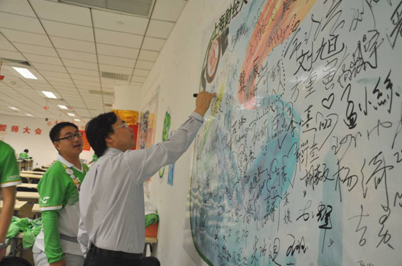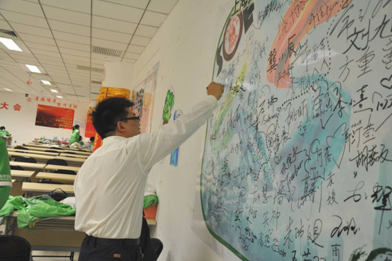 程老师在志愿者签名版上签名。