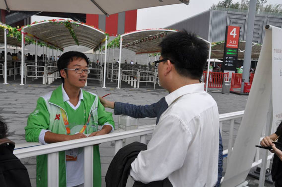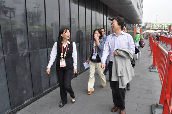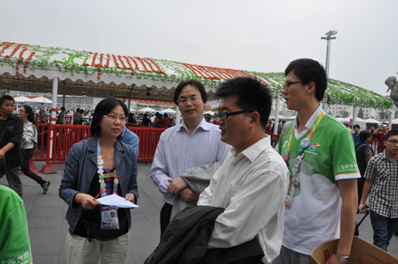 经济学院党委书记程霖老师与中国馆南广场的志愿者们握手并表扬所有在岗辛勤工作的志愿者们。