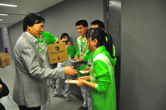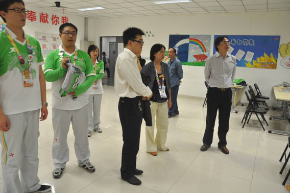 各位领导一行到志愿者休息区察看休息区情况,慰问在休息区休息的志愿者。