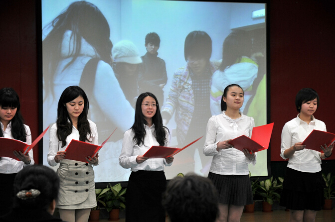十佳女大学生胡慧(中间)在校“纪念三八国际劳动妇女节101周年先进表彰暨联欢会”上表演节目 |