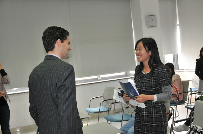 来访代表与本期我院硕士留学预修班法国南特高等商学院项目的同学私下交流