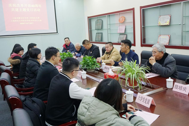 12月20日下午,在静安区军休三所会议室,为深入学习习近平总书记在庆祝改革开放40周年大会上的讲话精神,上海财经大学经济学院本科学生支部书记崔士超带领支部党员和静安区军休中心三所党总支部联合开展主题党日活动。本次活动以“喜迎改革开放40周年,倾听功臣老兵回顾峥嵘岁月”为主题,通过聆听离退休干部讲述我党我军艰难的发展历程,回顾改革开放40周年带来的深刻变化,让大学生党员领悟当下的幸福来之不易,珍惜现在的大学时光。静安区军休中心党委书记李军,上海财经大学经济学院党委副书记金晓茜观摩指导本次活动。活动由静安区军休中心三所党总支书记徐陆明主持。