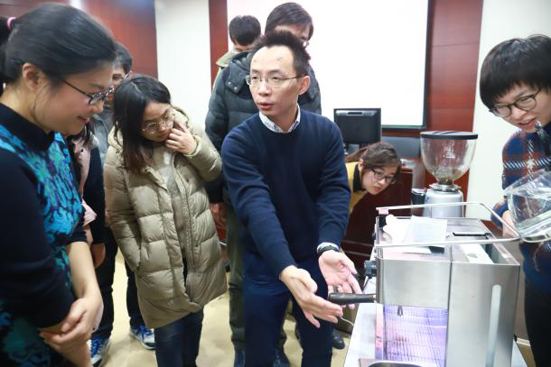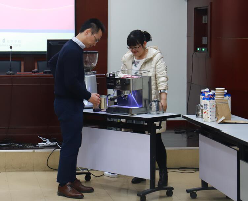 学院咖啡拉花大师唐前锋老师现场表演和教授咖啡拉花技巧。唐老师广而告之,学院501会议室有咖啡机和相关设备,欢迎大家随时到501办公室喝喝咖啡、聊聊天,放松心情。