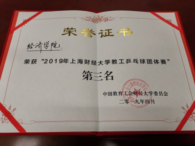 4月23日,“2019年上海财经大学教工乒乓球团体赛”决赛在国定路新体育馆举行,由学院教师胡永刚、常进雄、叶正茂、伍山林、张永超、周宇、金晓茜、沈燕君、魏文峰组成的经济学院教工乒乓球代表队顶住压力,奋勇拼搏,取得了全校第三名的好成绩。
