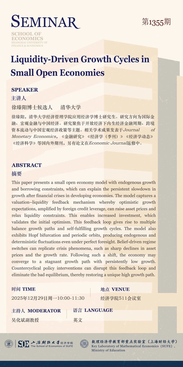 【第1355期】 12月29日宏观经济学学术讲座:Liquidity-Driven Growth Cycles in Small Open Economies(徐臻阳,博士候选人,清华大学)