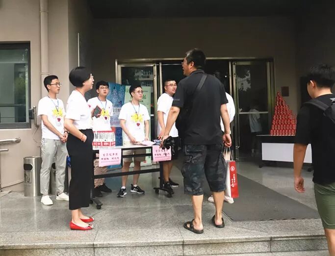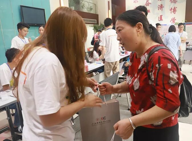 经济学院迎新工作周密而细致,于细节处体现人文关怀。今天一大早,迎新团队的成员们就开始忙碌起来,他们个个精神饱满、面带微笑,按照预先的安排,分配到了不同的岗位上。他们中有的负责在一楼大厅接待,有的负责引领,或者帮助新生及家长们拎行李;还有一些则负责采访新生,为新生在留言板前拍照;更有一批同学,在学校统一安排下,分配到附近的3号地铁线江湾镇站的出口处迎接新生。小编还特别注意到,今年的新生接待中有一群党员志愿者的身影,他们在学院入口最醒目的位置,打出了“有困难,找党员”的口号。
