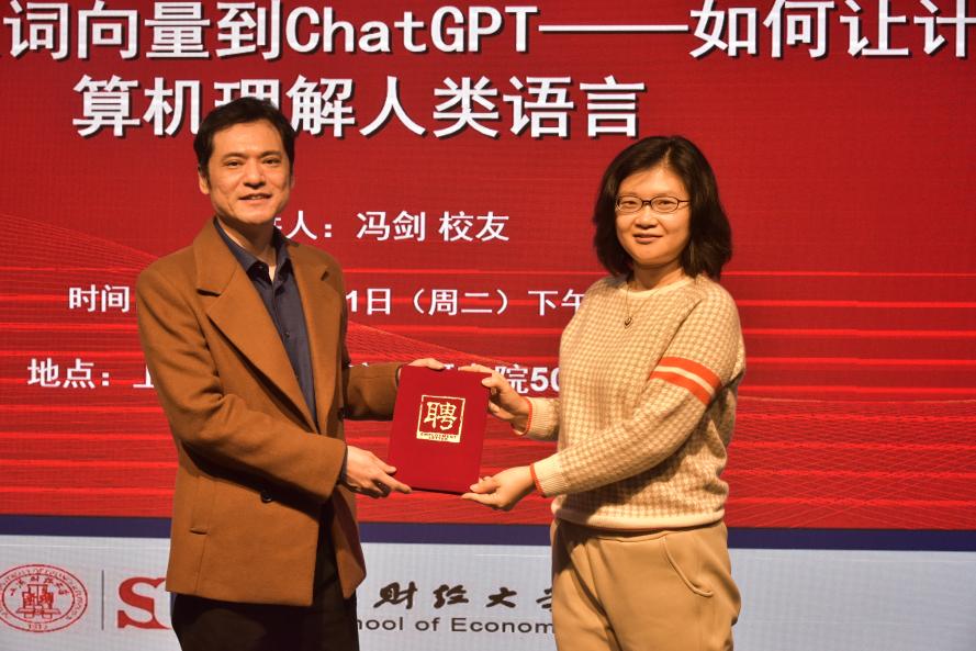 3月21日星期二下午,经济学院校友系列讲座第二十讲“从词向量到ChatGPT——如何让计算机理解人类语言”在上海财经大学武川路校区高等研究院502报告厅举行,本次活动特邀复旦大学博士、KPMG金融科技专家库成员-冯剑校友来校与同学们进行了面对面的交流,讲座现场,同学们通过冯老师的分享和同学们与老师的交流互动,充分了解了计算机是如何理解人类语言背后的逻辑,并重点讲述了自然语言处理(NLP)的主流发展路径,冯剑校友用举例和类比的方法,为经院学子提供一场通俗易懂的算法入门讲座。学院校友会负责人黄振兴常任教授、工会主席黄枫副研究员、校友会干事胡倩楠老师以及经济学院2006级戴聪聪校友参加讲座。