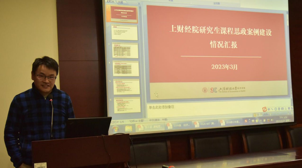 张永超常任副教授随后代表学院作研究生课程思政建设情况汇报。张老师首先回顾了研究生课程思政建设的时间表以及具体举措等,与本科课程思政推进工作的思路保持一致,研究生课程思政工作通过优秀案例评审、示范课建设等方式于2022年秋季学期完成了全覆盖工作;随后,他将部分优秀案例从“政治经济学知识体系、科学理性价值观;历史视野、中国优秀传统文化、革命文化和社会主义先进文化;扎根中国大地、讲好中国故事和国家战略、国家政策;社会现实、社会实践和践行企业的社会责任”等4个维度进行分类说明,并结合优秀案例获得者的具体案例进行了剖析与讲述。
