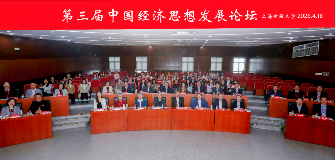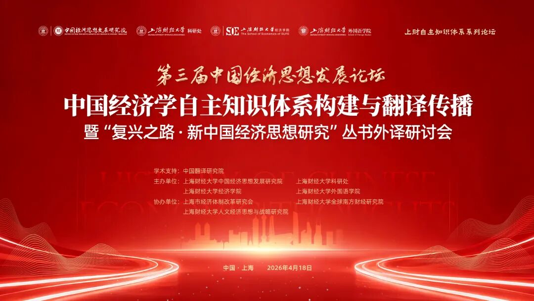 2026年4月18日,第三届中国经济思想发展论坛在上海财经大学召开。本届论坛聚焦“中国经济学自主知识体系构建与传播”暨“复兴之路·新中国经济思想研究”丛书外译研讨,旨在深入探讨中国经济理论的原创性贡献,推动构建中国经济学对外话语体系,发挥学术交流与理论创新的引领作用。中央马克思主义理论研究和建设工程咨询委员、首席专家,国家教材委员会委员顾海良,原外交部翻译室主任、原中国驻特立尼达和多巴哥大使徐亚男,上海财经大学党委书记许涛,以及来自清华大学、北京大学、复旦大学、上海交通大学、浙江大学、中国人民大学、南京大学、同济大学、中国社会科学院、上海财经大学、上海外国语大学、中南财经政法大学、深圳大学等国内数十所高校、科研机构与知名出版媒体的百余位专家学者及嘉宾代表出席会议。论坛由上海财经大学中国经济思想发展研究院、科研处、经济学院、外国语学院联合主办,上海市经济体制改革研究会、上海财经大学全球南方财经研究院、人文经济思想与战略研究院协办,并获中国翻译研究院学术支持。