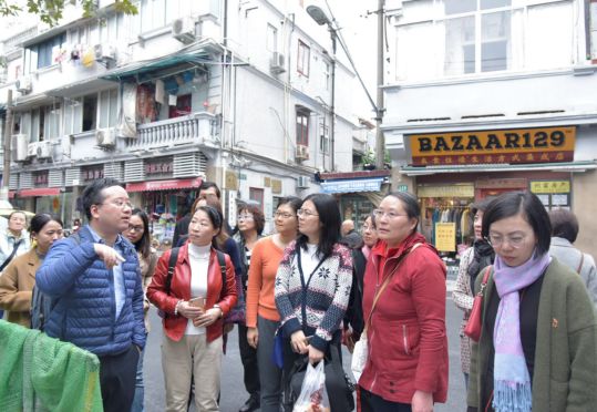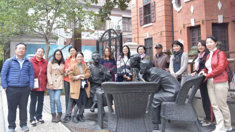 初冬的虹口,阳光温暖而稀疏,山阴路两旁树叶泛黄、色彩斑斓。女教工们徒步来到了活动首站——大陆新村鲁迅故居(山阴路132弄9号)。到这里才发现,故居恰逢整修,站在弄堂口,随着梁老师的现场讲解,体悟了鲁迅先生晚年生活一隅。
