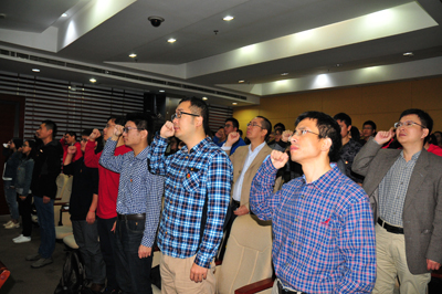 在聆听习近平总书记的报告前,学院全体师生党员收看了由中央组织部、中央电视台联合录制的以“喜迎十九大、共圆中国梦,走近学习榜样、凝聚复兴力量”为主题的特别节目《榜样2》,观看了南部战区空军航空兵某团团长、特级飞行员刘锐和马克思主义哲学家、中国人民大学哲学院教授陈先达的事迹,通过先进事迹再现、典型代表访谈、嘉宾现场讲述等形式,于平凡故事中领会深刻道理,切实感受到了优秀的共产党员是什么样子?为人民服务的公仆是什么样子?大家深受教育和鼓舞。随后,在党委书记王昉的主持下,全体党员举行了佩戴党徽、重温入党誓词的仪式。铮铮誓言不忘初心,对每个党员来说,都是庄严而神圣的承诺。