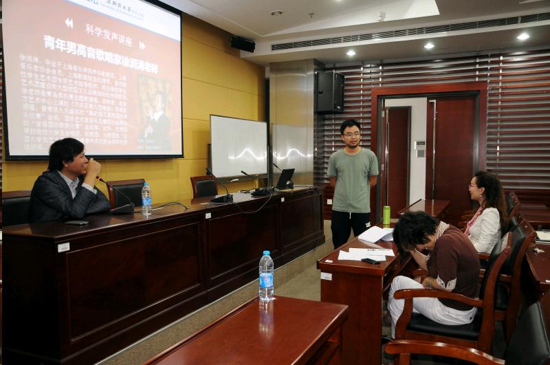 此次科学发声讲座专门邀请到了上海音乐家协会会员、上海歌剧院签约演员、我校学生艺术团建设和大型校园文化品牌活动的专职教师青年男高音歌唱家徐润涛老师。徐老师首先以琴弦为例讲解了声音发声的原理及发声器官构成,之后从气息、共鸣、发声技巧三个方面向介绍了基本的发声方法和一些实用的练习小技巧,让老师在今后的教学中可以轻松地保护嗓子。