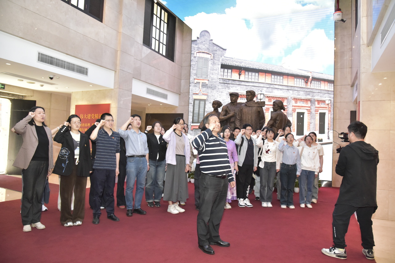 在纪念馆序厅中,全体党员面向党旗庄严列队,集体重温入党誓词,再一次用铮铮誓言诠释入党初心,坚定不移,终生不渝。