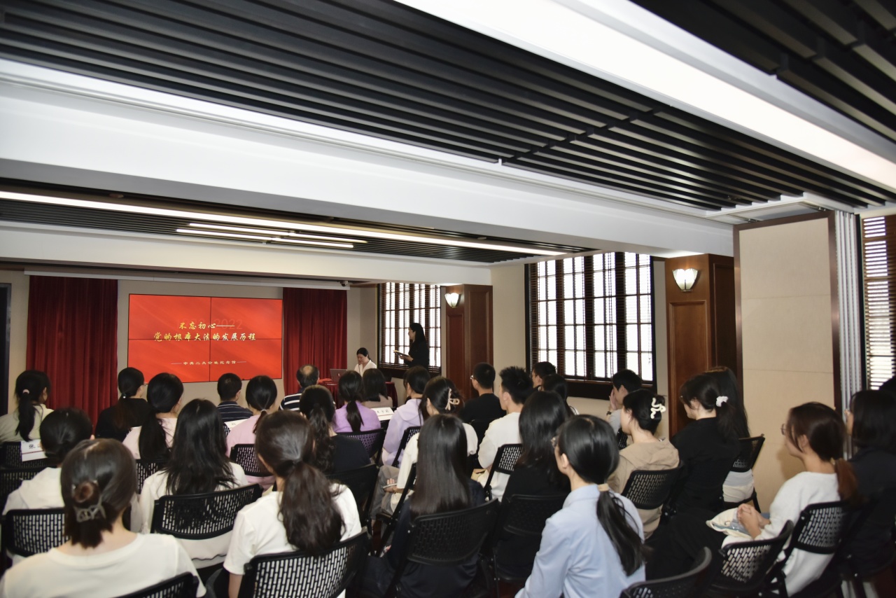 活动伊始,中共二大会址纪念馆研究部(党章研究中心办公室)负责人倪娜老师以《不忘初心——党的根本大法的发展历程》为题讲授主题党课。她介绍了中国共产党成立至今所产生的历届党章,详细阐释了其诞生的历史背景和产生的深远影响。她着重以首部党章和党的二十大党章为重点,深入剖析文本中蕴含的时代进步点和闪光点。