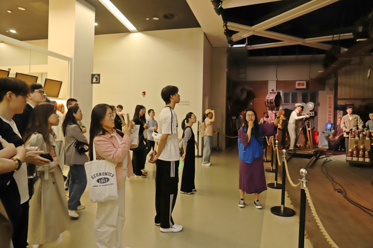 一楼“电影殿堂”展区重点展示了中国电影的发行放映历史。“百年发行放映”展区通过不同时期的电影海报、放映设备和票证等实物,系统梳理了中国电影传播的历程。“水银灯下的南京路”实景展区还原了经典电影的拍摄场景,让参观者身临其境地感受电影创作的氛围。在互动放映区,师生们观看了《乌鸦与麻雀》的创作片段,通过结合拍摄准备期间工作人员的对话与拍摄时演员的表现,身临其境体会了电影拍摄的详细过程。