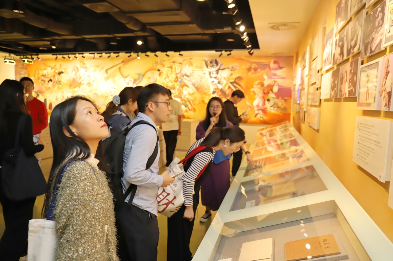 三楼“影史长河”展区以时间轴形式展现了上海电影百年发展历程。从早期电影脚本到现代拍摄设备,完整呈现了中国电影技术的演进轨迹。在“大闹天宫”专题展区,《西游记》《黑猫警长》《葫芦娃》等经典动画作品的创作手稿和分镜脚本,展示了中国动画艺术的独特魅力。尤其是一组《大闹天宫》的15万张手绘底稿,让师生们直观感受到老一辈动画工作者的工匠精神。