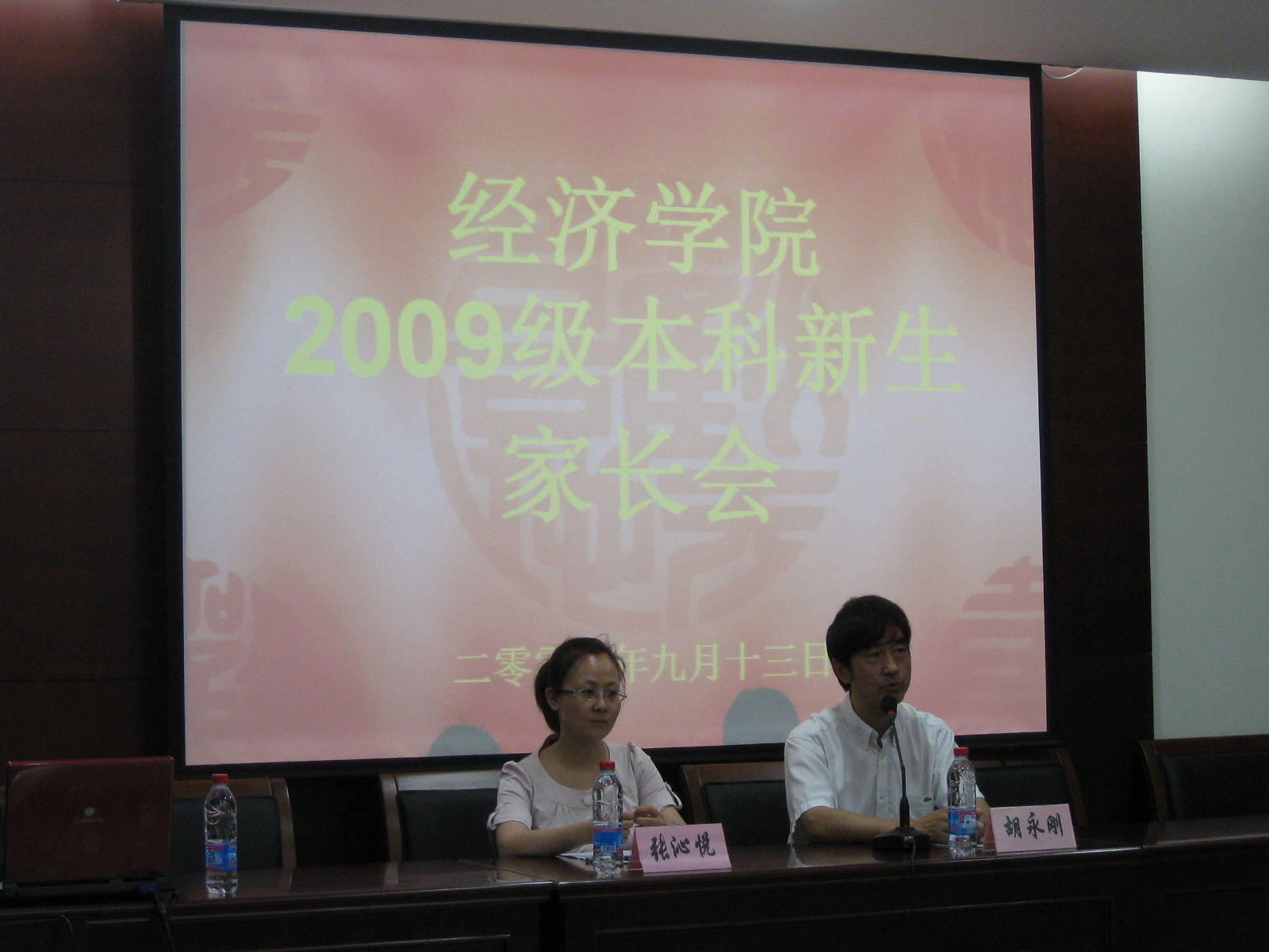 | 为了帮助家长更好的了解经济学院的情况,加强学院与家长的沟通与合作,更好的管理和教育大学新生,经济学院于2009年9月13日在学院大楼607召开2009级本科新生家长见面会,会议由辅导员金晓茜老师主持,经济学院常务副院长胡永刚教授、院长助理分管本科教学工作的张沁悦老师出席见面会,向130多位本科新生家长介绍经济学院的概况并回答家长的提问。
