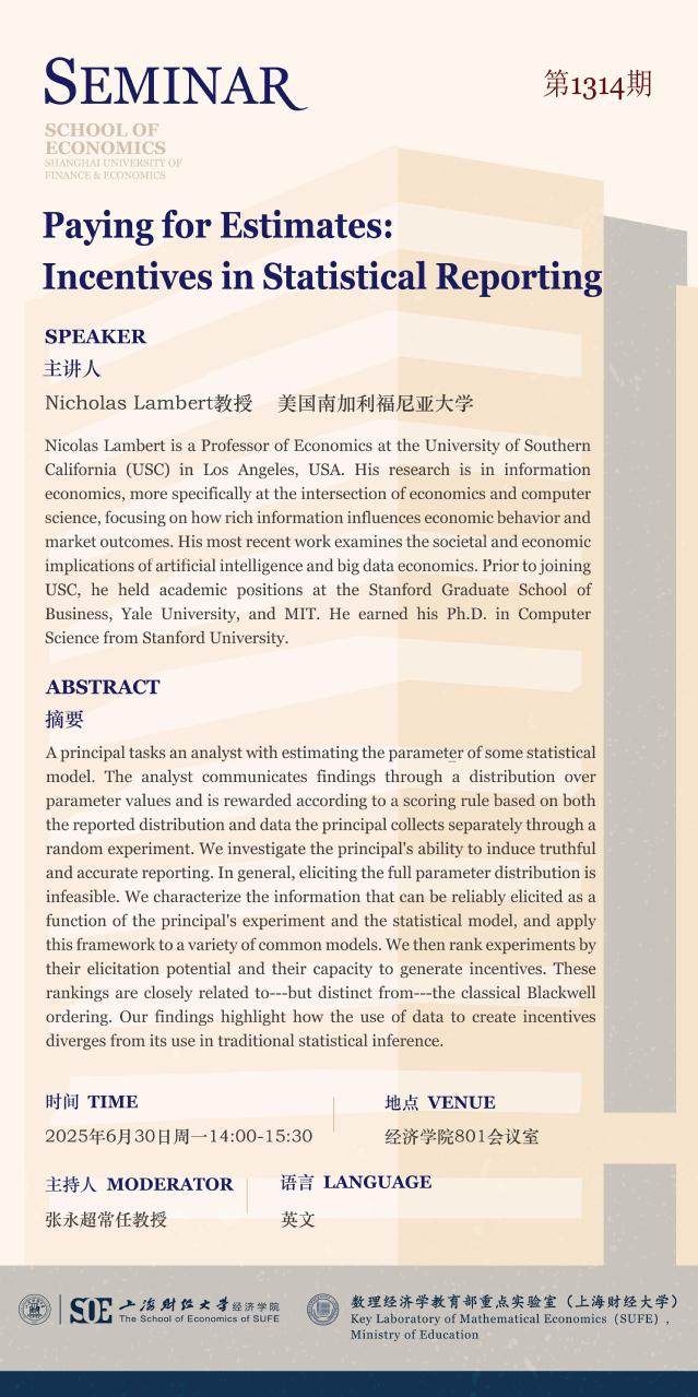 【第1314期】6月30日微观经济学学术讲座:Paying for Estimates: Incentives in Statistical Reporting(Nicholas Lambert,教授,美国南加利福尼亚大学)