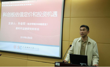 5月8日,匡时论坛·经济学院校友系列讲座第十三讲在经济学院楼710会议室开讲。我院2008级校友、新时代证券研究所所长孙金钜作客论坛,为学院2018级金融专硕研究生们带来了一场题目为“科创板估值定价和投资机遇”的讲座,本次讲座同时也是我院首场金融专硕实践课程系列讲座。经济学院数量经济学系系主任、金融专硕项目主任周亚虹教授,校友分会副秘书长王越男老师以及部分师生、校友到场聆听。周亚虹教授主持活动。