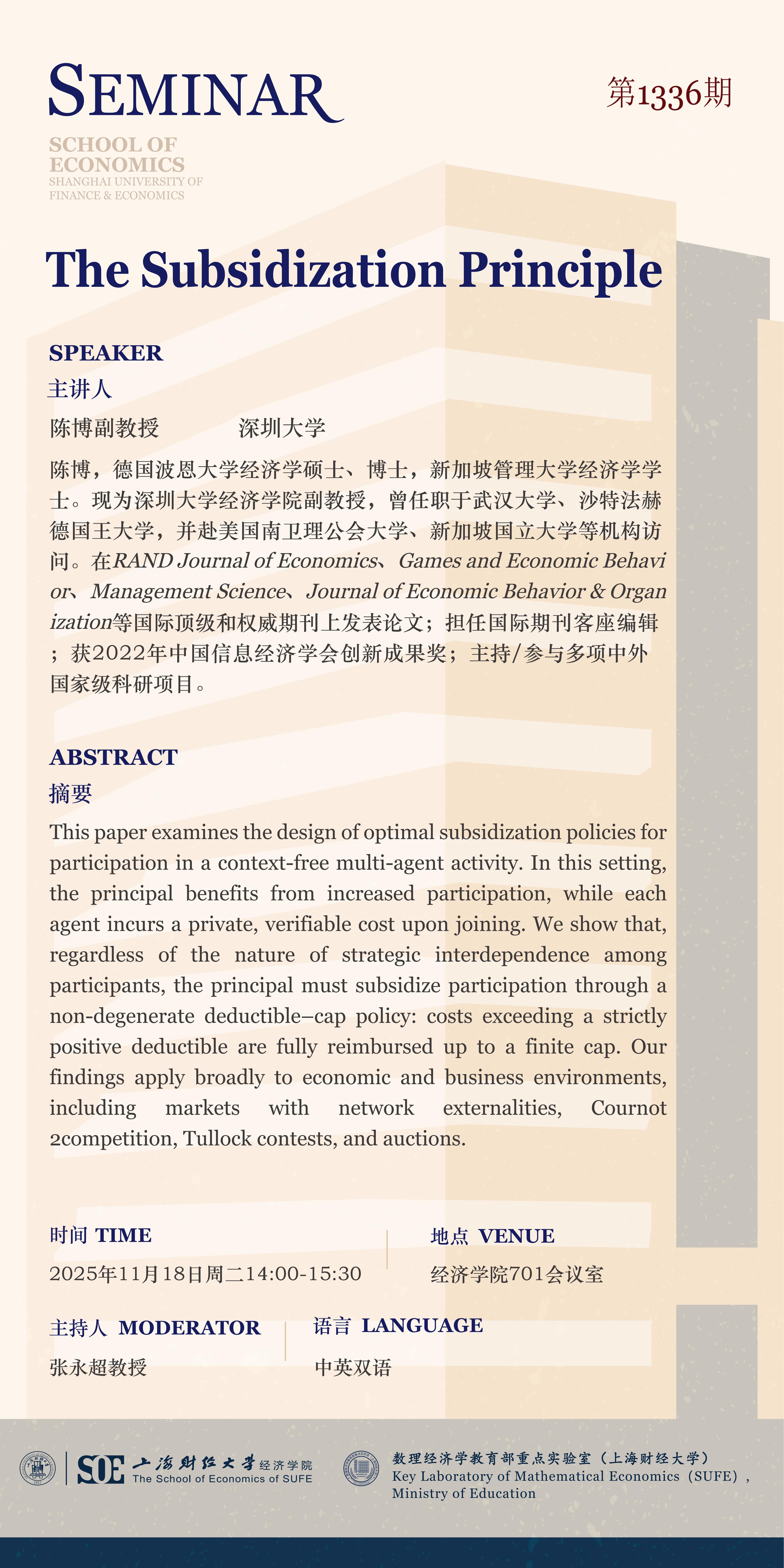 【第1336期】11月18日微观经济学学术讲座:The Subsidization Principle(陈博,副教授,深圳大学)