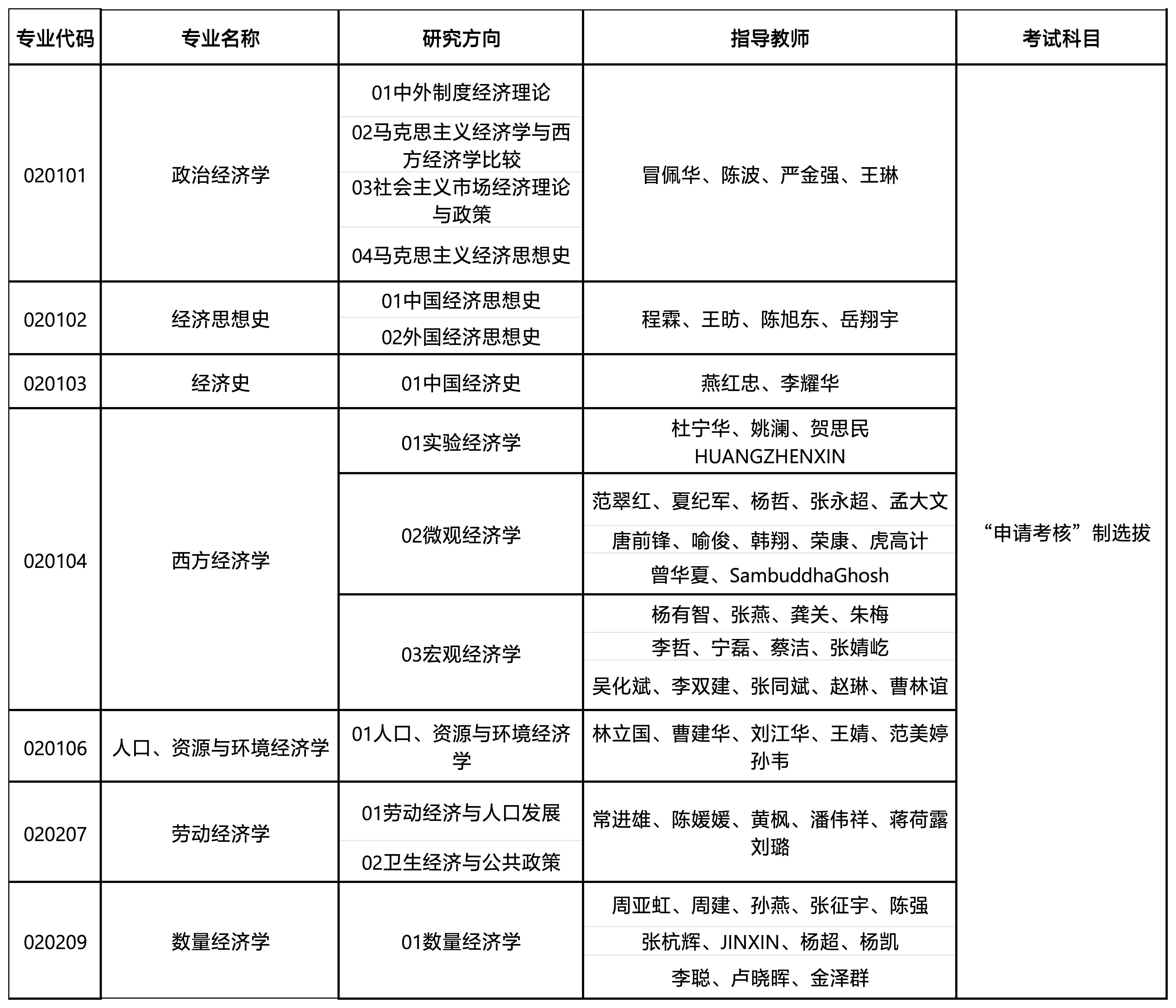 目前,经济学院下设政治经济学系、经济史学系、宏观经济学系、微观经济学系、计量经济学系、资源与环境经济学系、劳动经济学系,拥有理论经济学一级学科博士学位授予权和博士后流动站,设有政治经济学、经济思想史、经济史、西方经济学、数量经济学、人口资源与环境经济学、劳动经济学等7个硕士和博士学术型专业点和金融专业硕士(金融计量、大数据金融、国际组织人才培养方向),以及涵盖国家经济学基础人才培养基地班、经济学拔尖班、数量经济班、劳动经济学、世界经济学等专业方向的经济学本科专业。