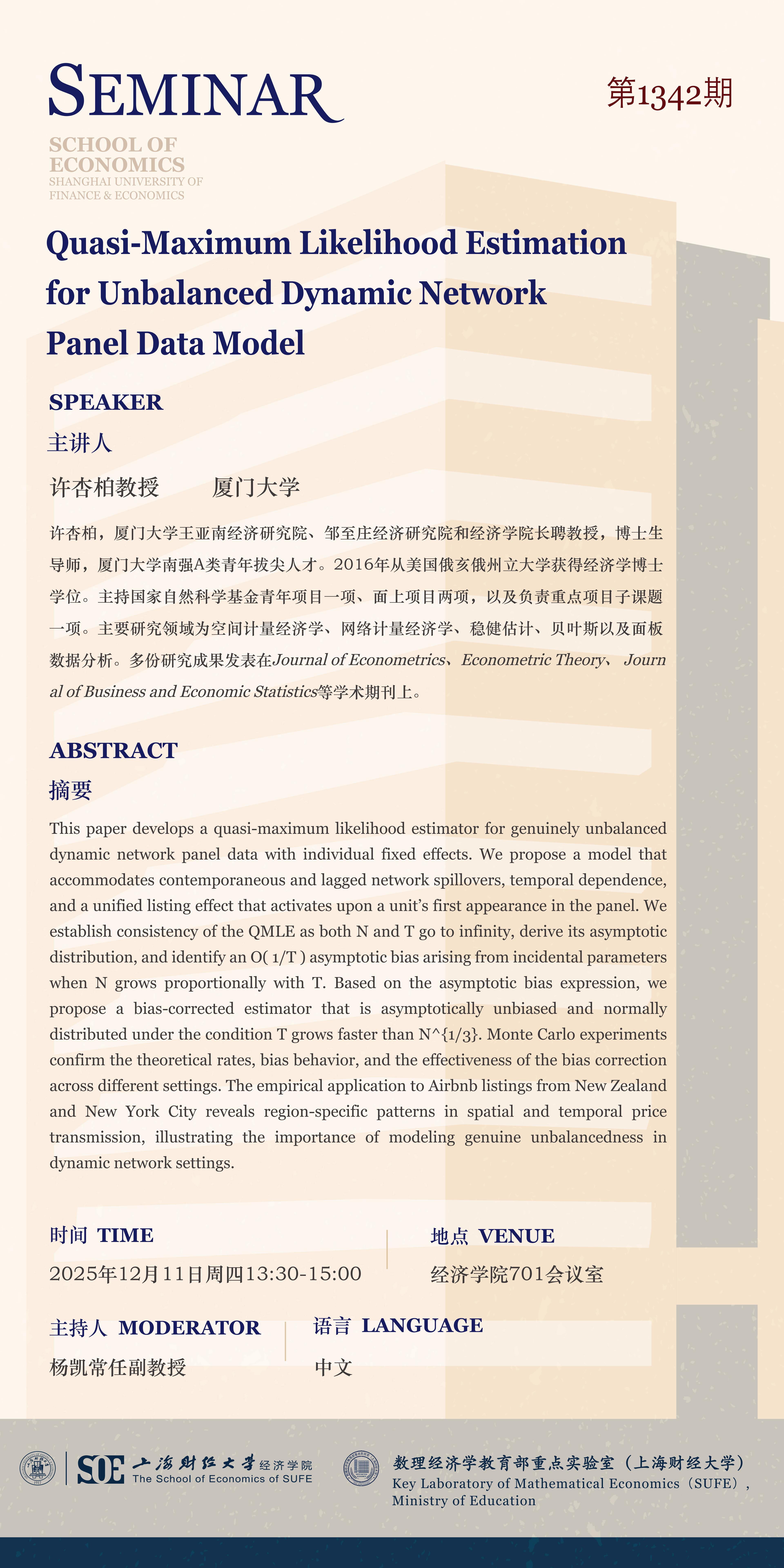 【第1342期】12月11日计量经济学学术讲座:Quasi-Maximum Likelihood Estimation for Unbalanced Dynamic Network Panel Data Model(许杏柏,教授,厦门大学)