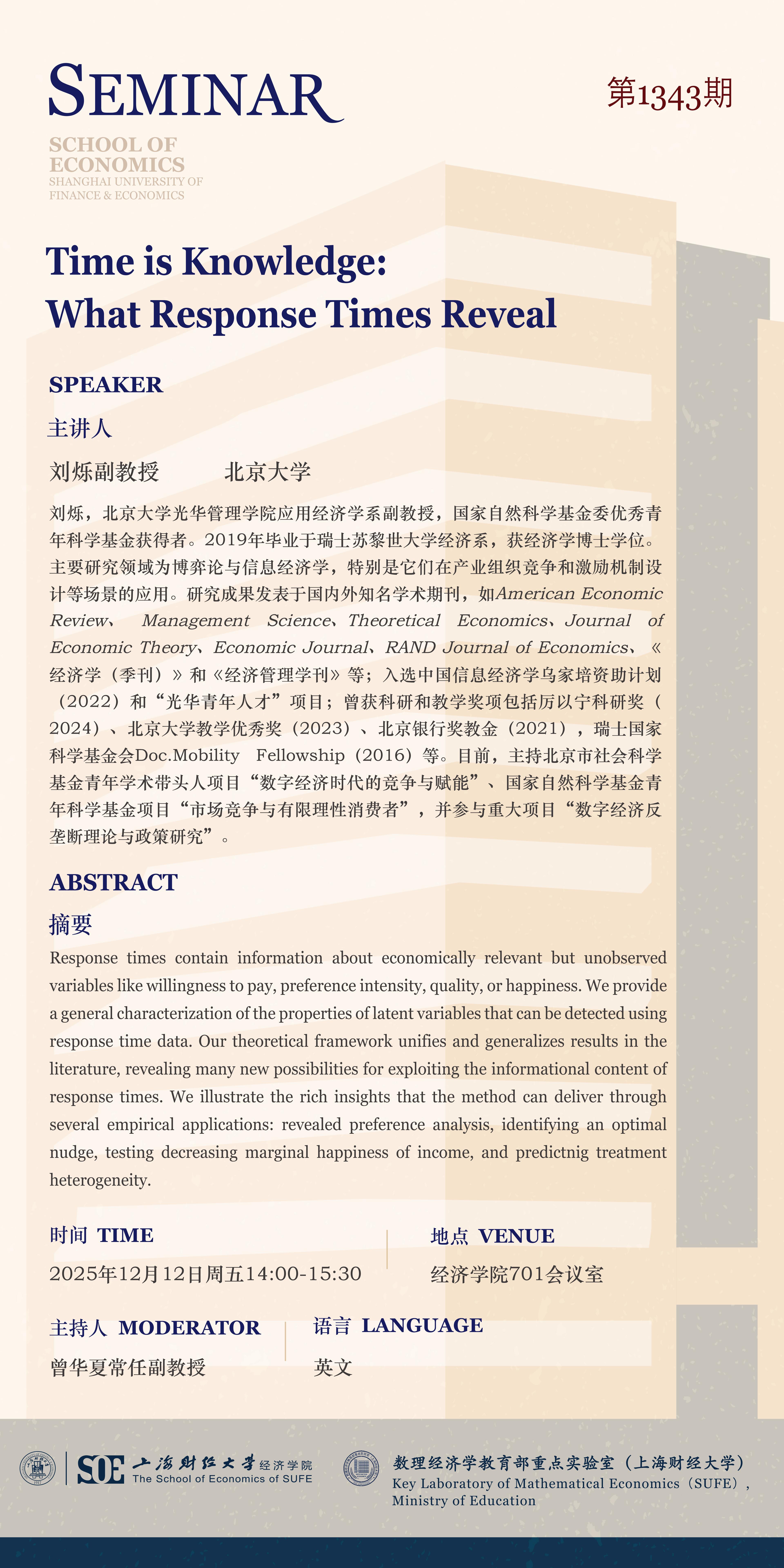 【第1343期】12月12日微观经济学学术讲座:Time is Knowledge: What Response Times Reveal(刘烁,副教授,北京大学