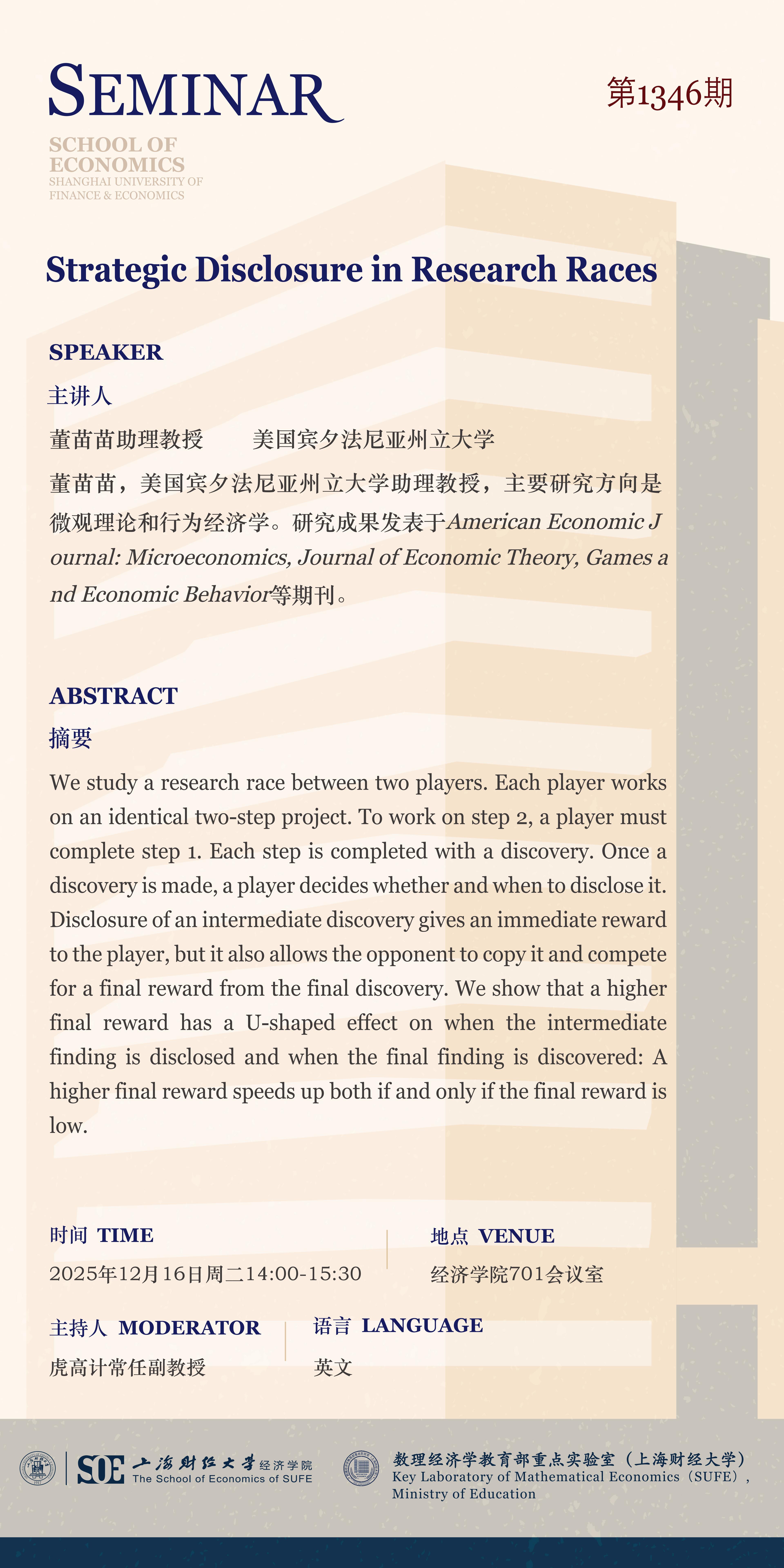 【第1346期】12月16日微观经济学学术讲座:Strategic Disclosure in Research Races(董苗苗,助理教授,美国宾州州立大学)