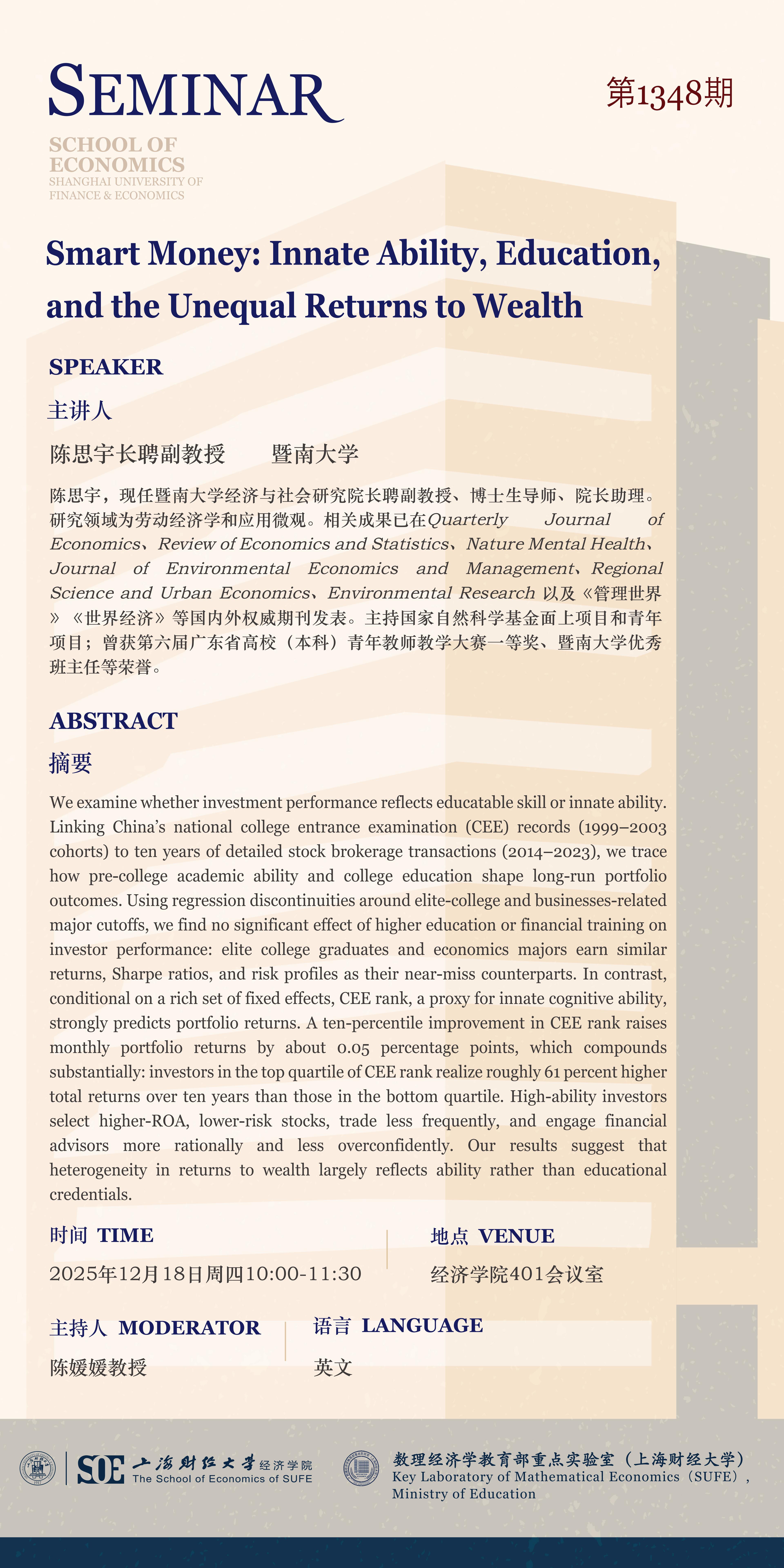 【第1348期】12月18日劳动经济学学术讲座:Smart Money: Innate Ability, Education, and the Unequal Returns to Wealth(陈思宇,长聘副教授,暨南大学