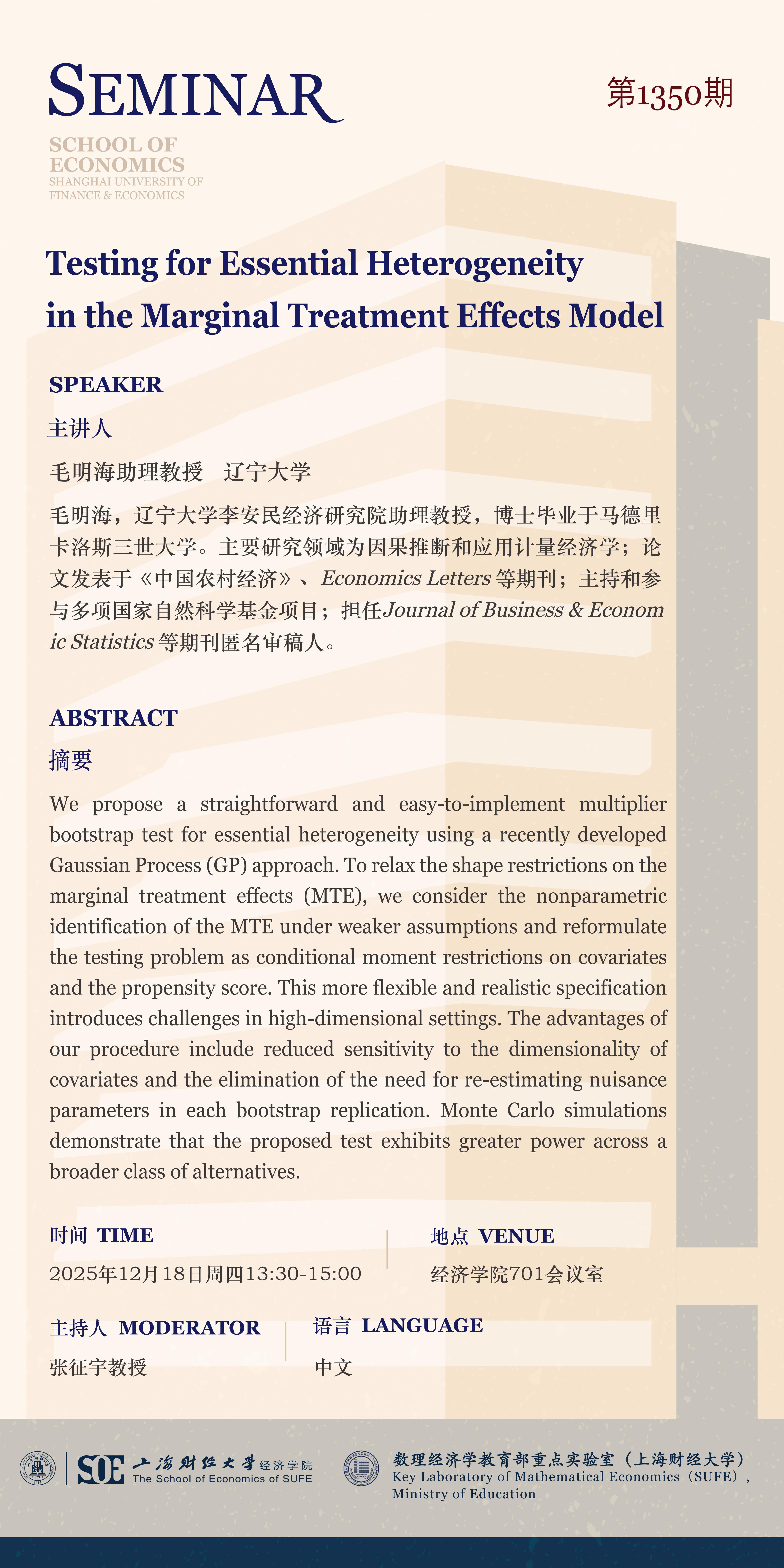 【第1350期】12月18日计量经济学学术讲座:Testing for Essential Heterogeneity in the Marginal Treatment Effects Model(毛明海,助理教授,辽宁大学)