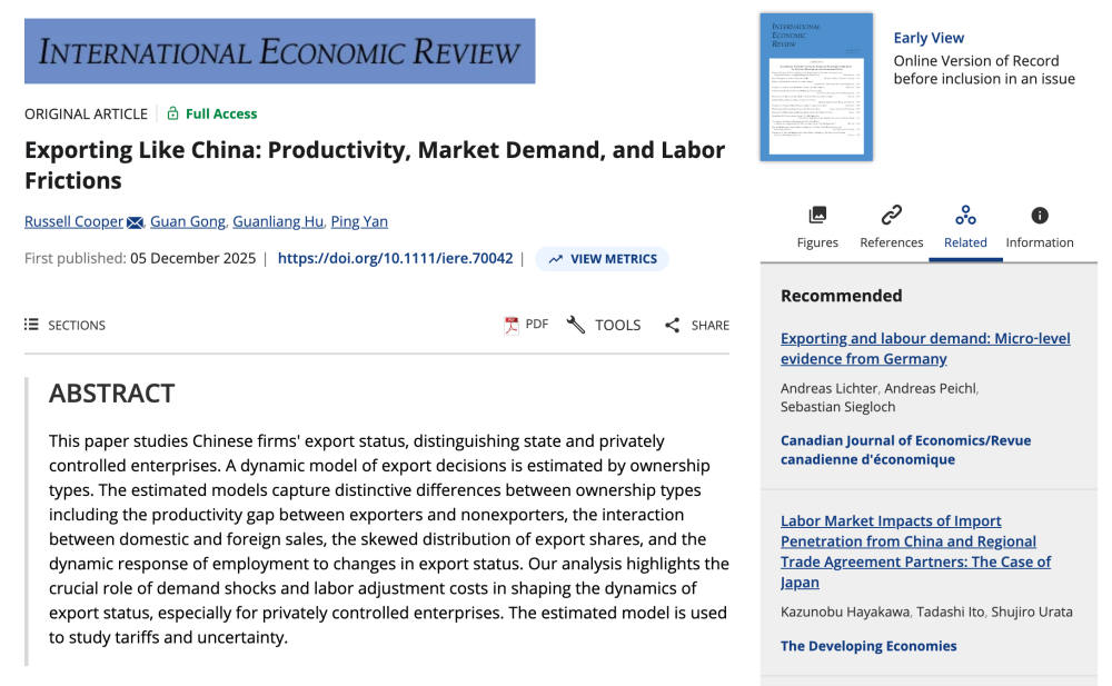 近日,上海财经大学经济学院宏观经济学系龚关常任教授合作论文Exporting Like China: Productivity, Market Demand, and Labor Frictions在经济学国际一类期刊International Economic Review在线发表。