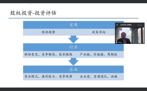 关于股权投资的核心工作,苏青岗校友从募、投、管、退四个方面,用详细的语言和生动的案例,帮助大家进一步了解每一环节的关键点。在募集资金方面,主流募集的对象有个人投资者与机构投资者。在投资项目的筛选方面,苏青岗校友以例示的方式着重讲解了影响投资的主要因素,如投资策略、投资逻辑、行业环境、宏观经济、企业变化等等。同时,苏青岗校友从投资评估出发,以“宏观—行业—企业”自上而下的视角,为同学们讲解了股权投资的方法论。