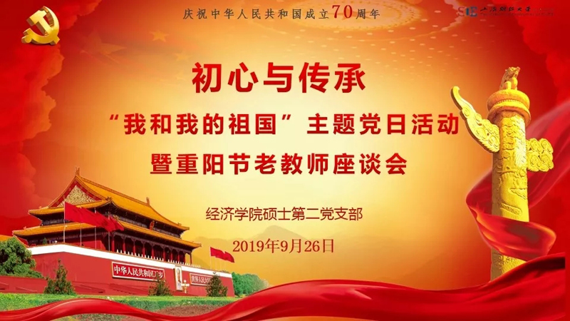 喜迎祖国70华诞,恰逢传统重阳佳节,9月26日,上财经院硕士第二党支部的同学们邀请我院离退休老师们重聚校园,开展了以“我和我的祖国”为题的主题党日暨重阳节老教师座谈会活动。在这个感恩的季节,上财经院师生向师者致礼,向前辈致敬,从这些曾经为学校发展默默奉献、辛勤耕耘的老教师们身上感受老一辈上财人的初心、使命!传承一代代上财人的家国情怀!