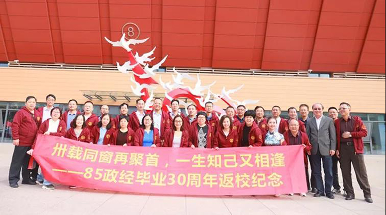 签到现场,多年未见的老同学们相互寒暄,互道问候,其中,1989届政治经济学班全班33人统一着“SUFE LOGO”校友文化衫在广场的腾飞雕塑前合影留言,瞬间成为全广场的焦点。他们说着、笑着,分享各自的近况与喜悦。