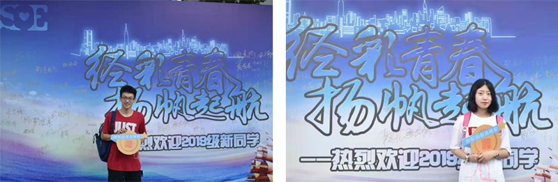 (报道完成后,新生们在迎新幕上签字并拍照留影)