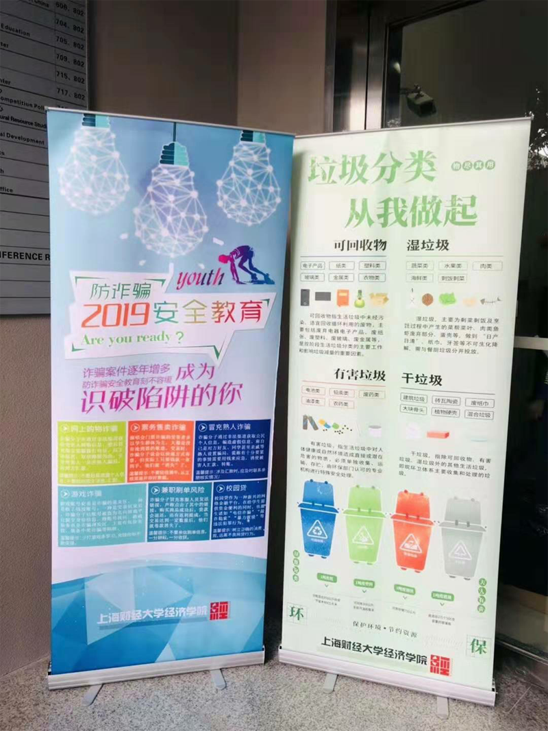此外,在迎新过程中,经济学院特别设立了校园防诈骗教育与垃圾分类的宣传易拉宝,放在经济学院门口显著的位置,旨在培养学生的防诈骗意识与垃圾分类意识,增强学生对学校环境的信任和安全感。