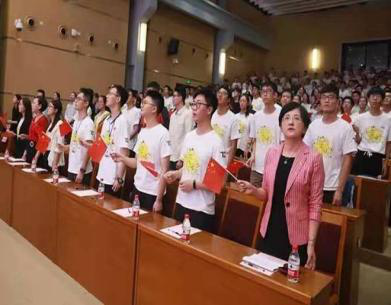 在经济学院新生见面会上,经济学院同学们和到场的老师们贴上国旗脸贴、挥舞着手中的国旗,一同高歌《我和我的祖国》和《歌唱祖国》为祖国献礼!