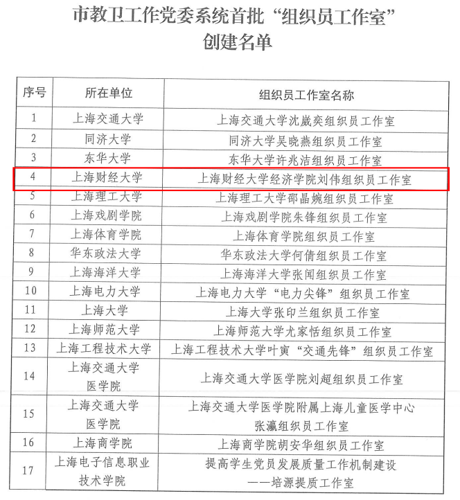 近日,上海市教卫工作党委公布首批“组织员工作室”培育创建单位名单,经学校推荐、通讯评审、现场答辩、名单公示等环节,共遴选建设17个“组织员工作室”,我校经济学院“刘伟组织员工作室”获批立项建设。