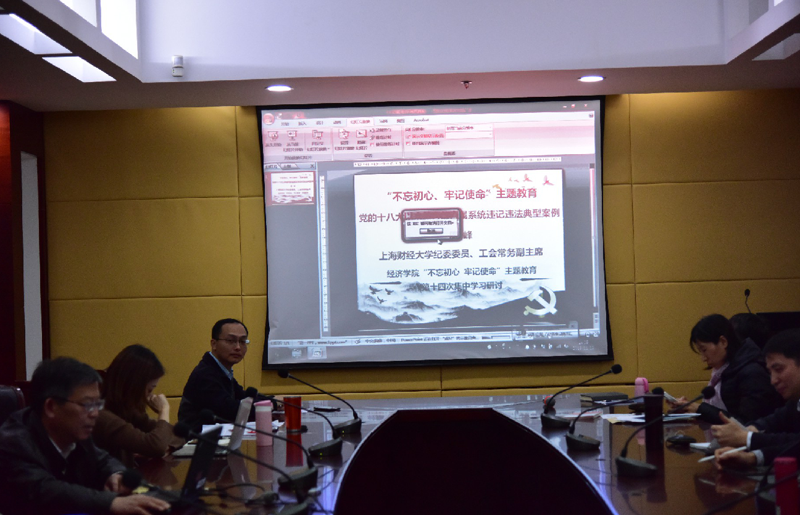 20191119午,上海财经大学纪委委员工会常务副主席周峰到经济学院做“不忘初心、牢记使命党纪警示教育讲座,这也是经济学院“不忘初心、主题教育”第十四次集中学习研讨会。讲座在经济学院楼710会议室举行,学院领导班子成员、党委委员、支部书记和支委代表近20参会,会议由学院党委书记王昉主持